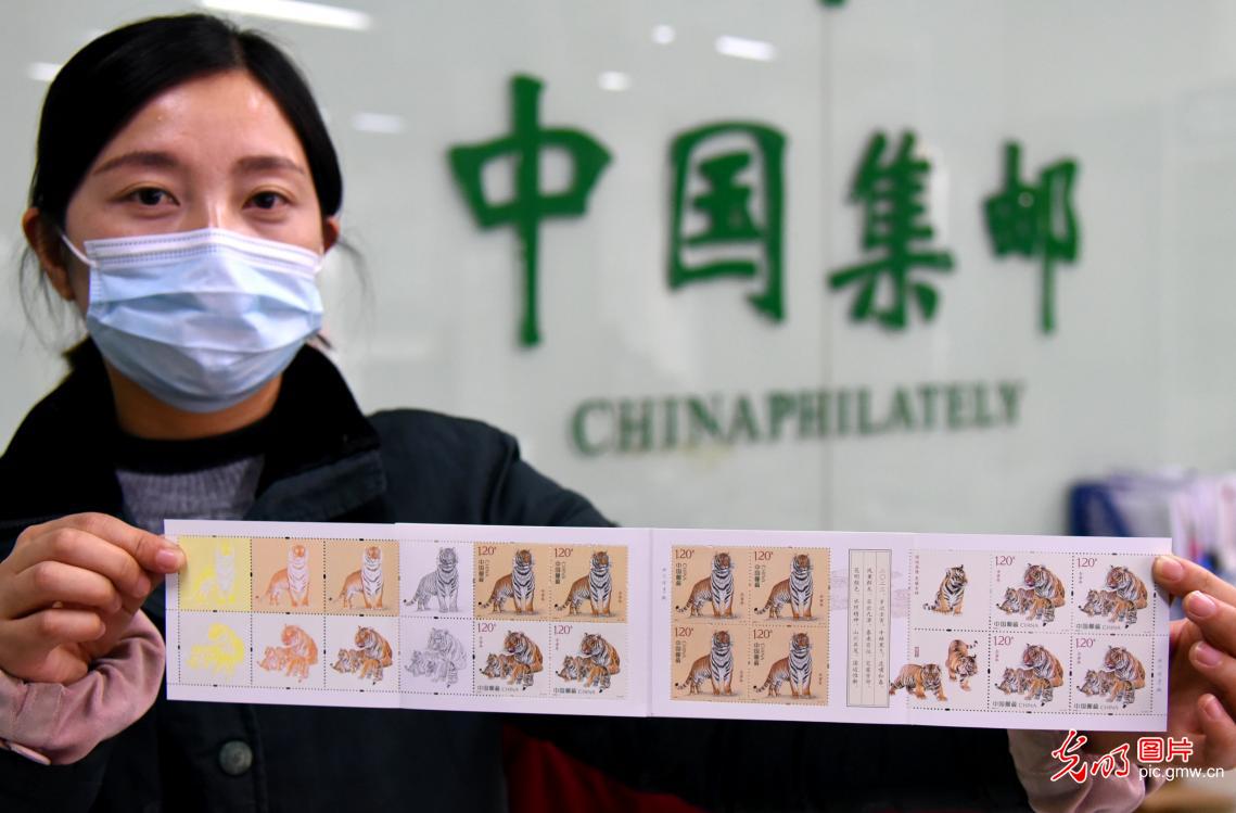 2022年1月4日,江苏省连云港市海州区苍梧路集邮网点,工作人员在展示即将发行的《壬寅年》特种邮票。《壬寅年》特种邮票于1月5日正式发行,一套共分2枚,全套邮票面值为2。4元,邮票图案分别是:国运昌隆、虎蕴吉祥。(耿玉和摄/光明图片)