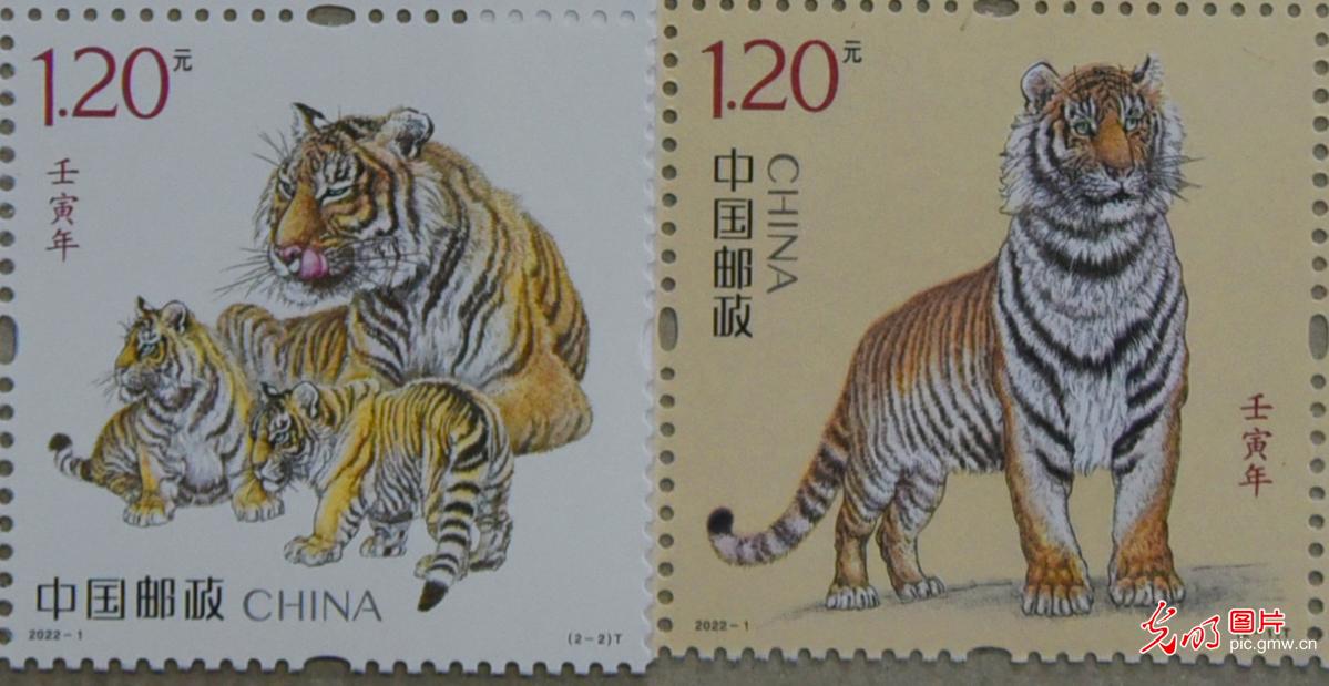 2022年1月4日,在江苏省连云港市海州区苍梧路集邮网点拍摄的即将发行的《壬寅年》特种邮票。《壬寅年》特种邮票于1月5日正式发行,一套共分2枚,全套邮票面值为2。4元,邮票图案分别是:国运昌隆、虎蕴吉祥。(耿玉和摄/光明图片)