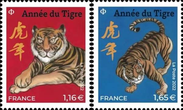 此次发行的中国农历虎年生肖纪念邮票共两款:其中一款面值1。16欧元,票面是红色背景下威严静坐的老虎,象征力量;另一款面值1。65欧元,票面是蓝色背景下伫立远眺的老虎,象征希望。